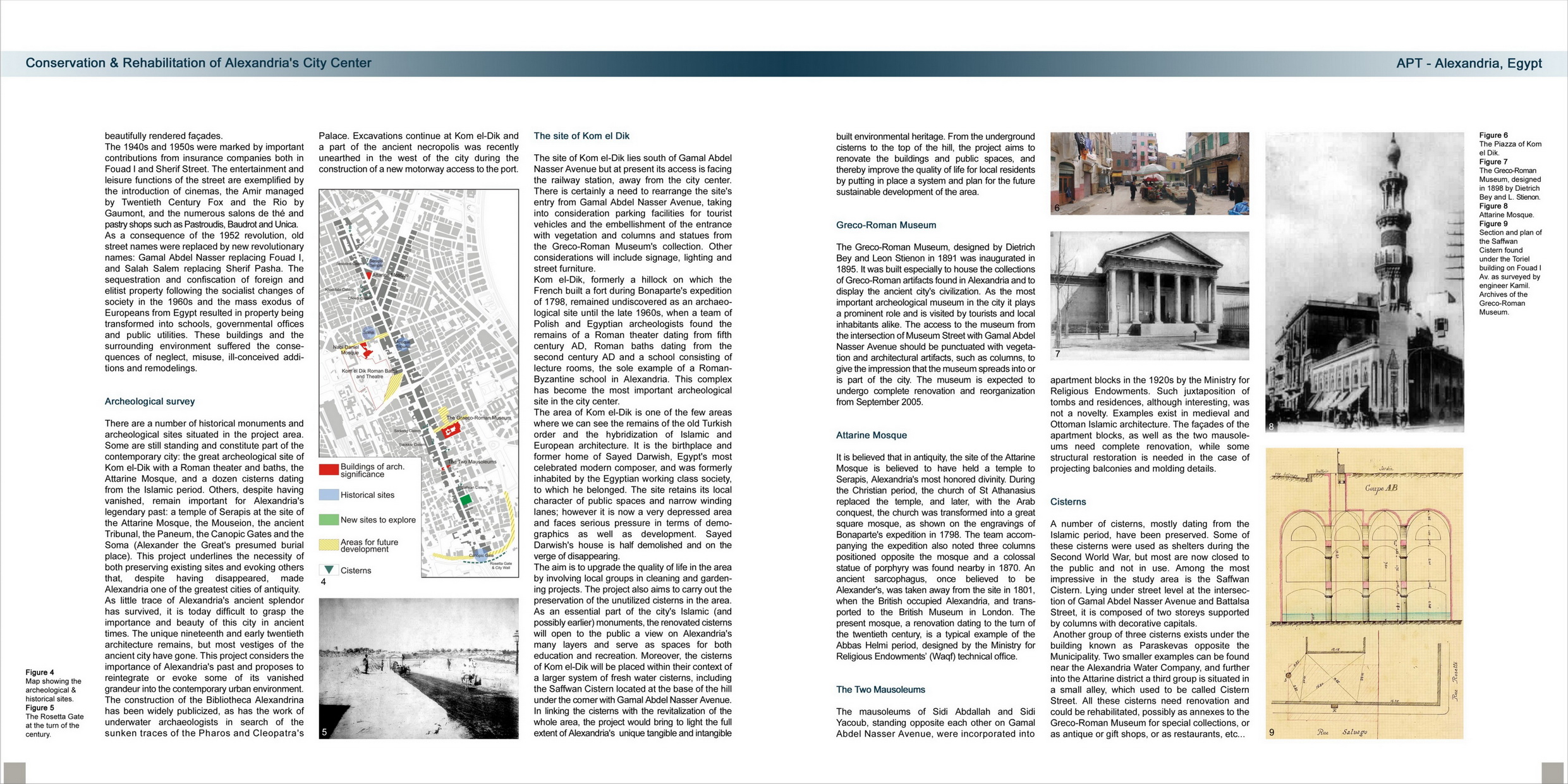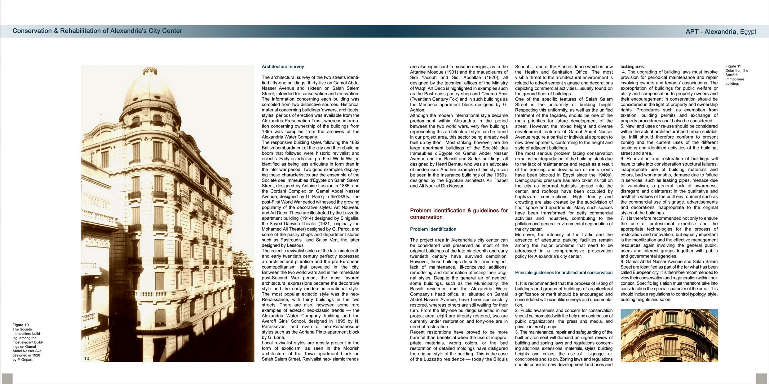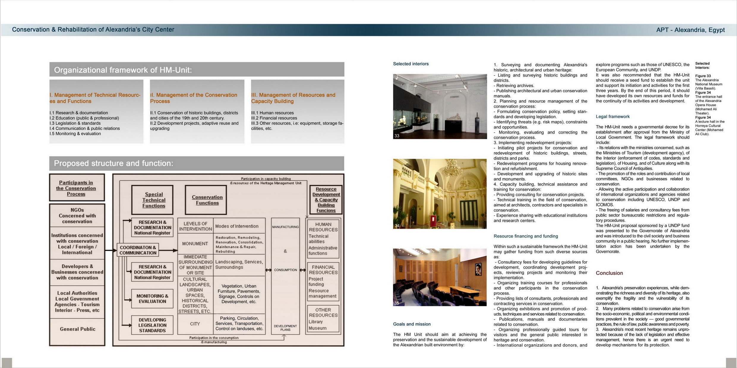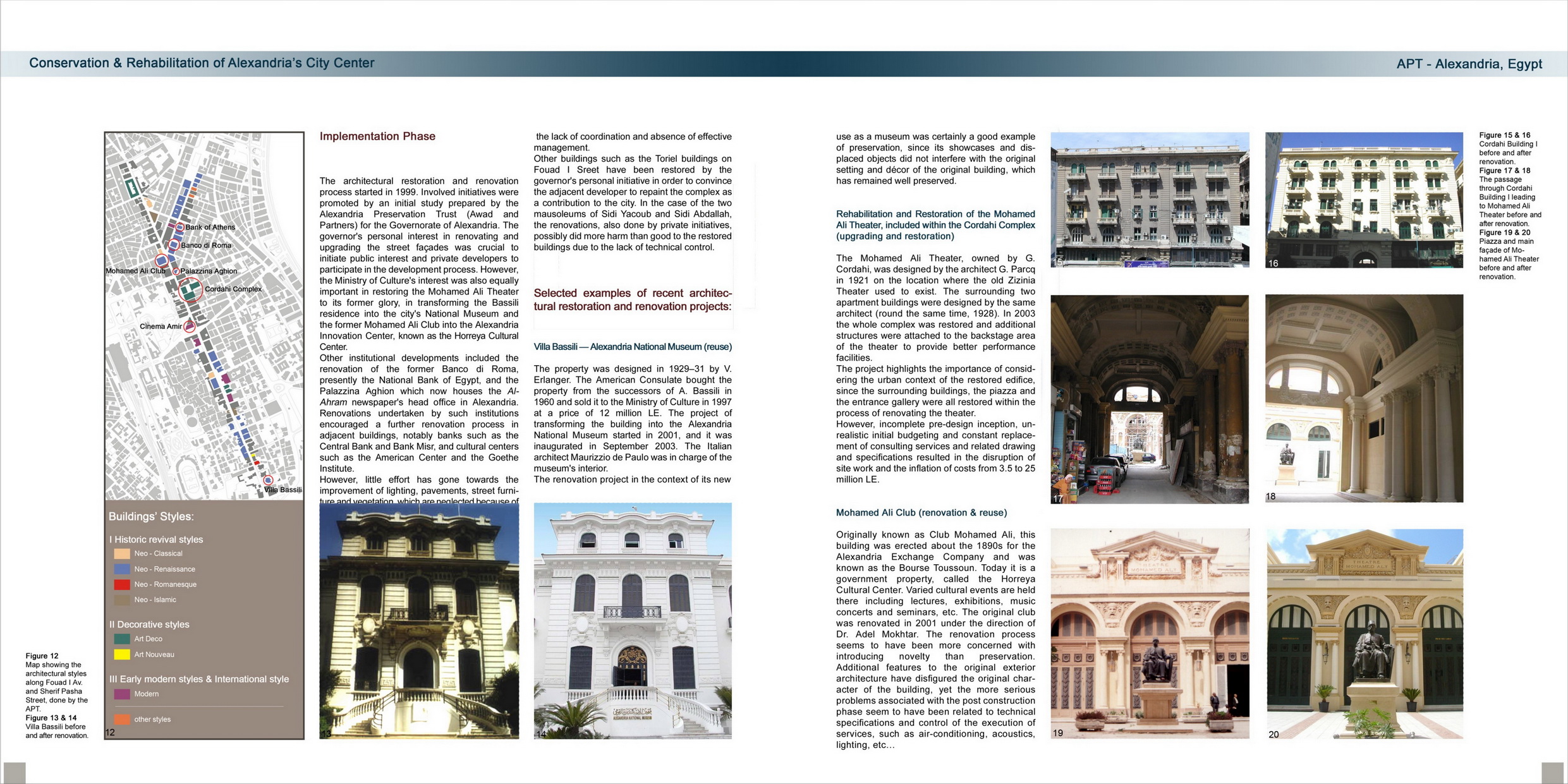 Concrete results and impacts in renovation, re-use and upgrading of the city center are incremental interventions on the urban and built environments such as: renovations concerning bank premises (National and Central banks, Maritime Bank); cinemas and theatres (Amir, Rio and Royal cinemas, Teatro Iskindireya); restaurants (Sigma Development); renovations and upgrading undertaken by the Ministry of Culture (Creativity Center, the Opera House and the Graeco-Roman and National museums); civil society (Rotary and Lions) renovations in urban signage and street furniture. Also the creation of an NGO representing owners and tenants of Salah Salem Street.